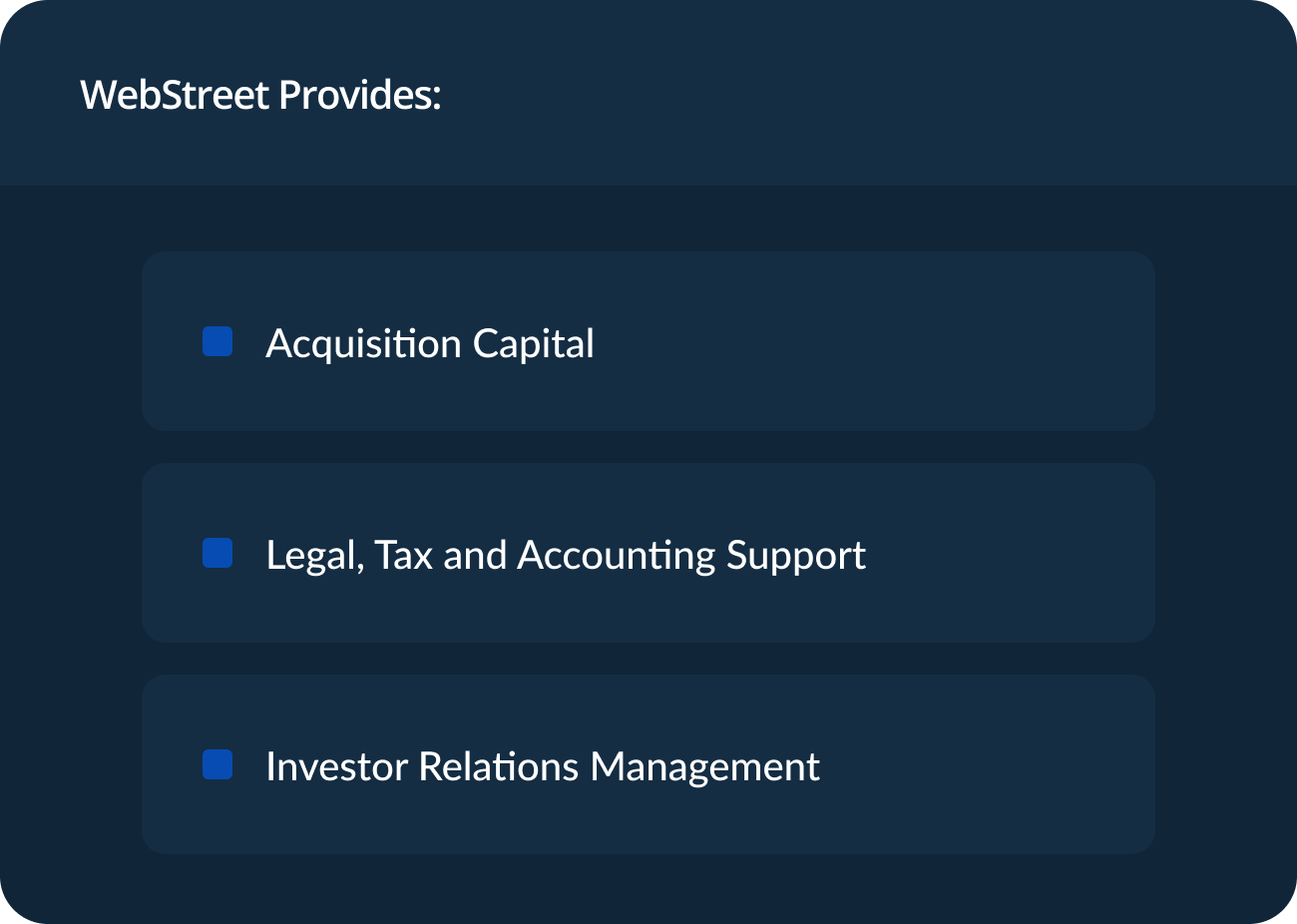 WebStreet takes care of the logistical stuff so you can focus on what you do best: manage and grow the portfolio. You’ll choose the businesses to acquire and run them independently, just like you do right now with your own portfolio. The difference is you’ll have a much larger pool of capital to execute your strategy.